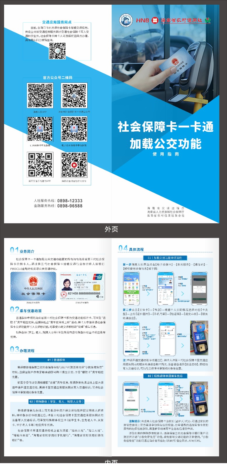 新聞發布會透露,今年4月,海南省交通廳會同省人社廳開始啟動社會保障卡一卡通加載公共交通功能的工作,前期開展電子社會保障卡加載交通運輸部互聯互通碼的對接、公交掃碼機具的投放以及相關系統的升級改造工作。目前,海南已完成全省主要市縣社會保障卡公交讀卡終端機具改造、電子社保卡加載交通碼等工作,從12月15日開始,海口市居民可持第三代社會保障卡刷卡乘坐城市公交車,特殊群體還可享受優惠服務,明年將在全省各市縣逐步推廣,并將上線電子社保卡掃碼乘車應用。