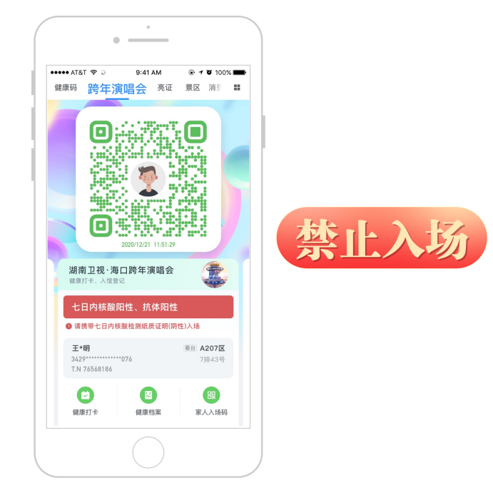 按《通告》要求,入場需要出示“碼上辦事”生成的跨年演唱會二維碼(已集成海南健康碼、核酸檢測信息、票務信息等)、紙質演出票、身份證、紙質核酸檢測證明,經核查無誤后方可進場觀演。