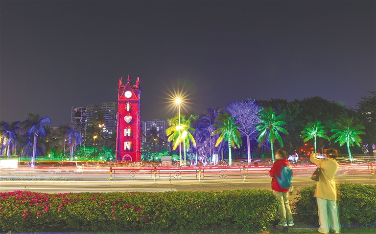 1月2日晚,一場(chǎng)燈光秀在海口鐘樓舉辦,吸引路人駐足觀看。海南日?qǐng)?bào)記者 李天平 攝