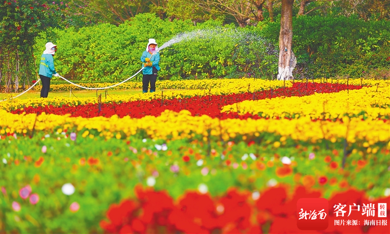 2月3日,為營(yíng)造喜慶祥和的節(jié)日氛圍,在海口市濱江路,園林工人給鮮花澆水。海南日?qǐng)?bào)記者 張茂 攝