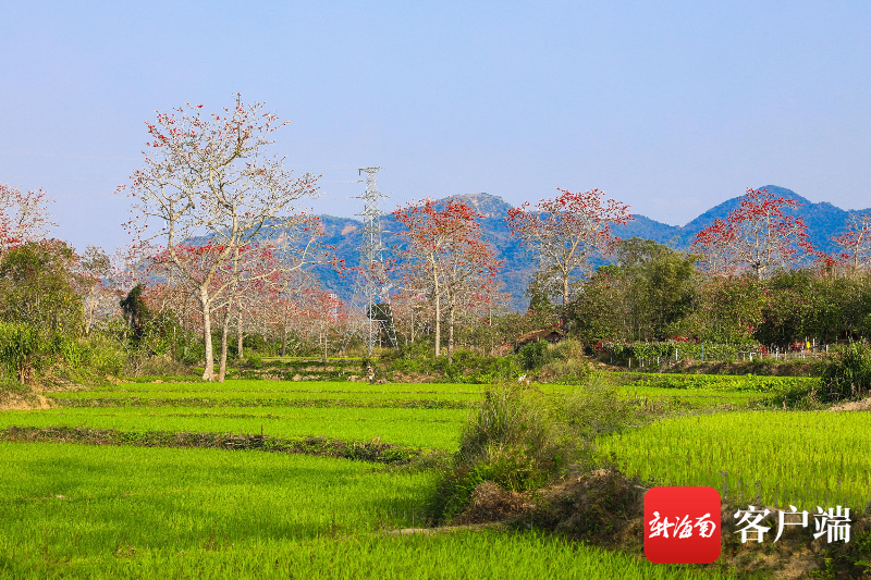 清晨,走進排岸村,綿延1.6公里的木棉紅美不勝收,“火車木棉紅”景觀更是一絕。如果不想走太遠,那就沿著村里的木棉棧道走一圈。木棉花開恰逢春來,木棉樹下,勤勞的黎家人俯身插上秧苗,木棉稻田,花紅稻綠,好一幅瓊島春耕圖。