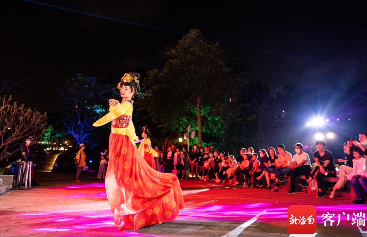 3月14日晚,海口市五公祠不倒翁演員身著華服,纖纖手臂揮舞衣袖蹁躚靈動,引來不少市民游客圍觀互動。記者 李昊 攝