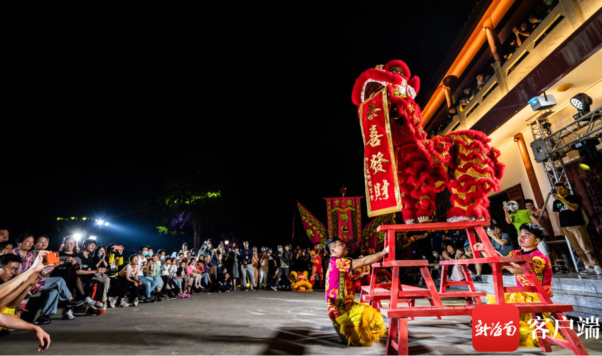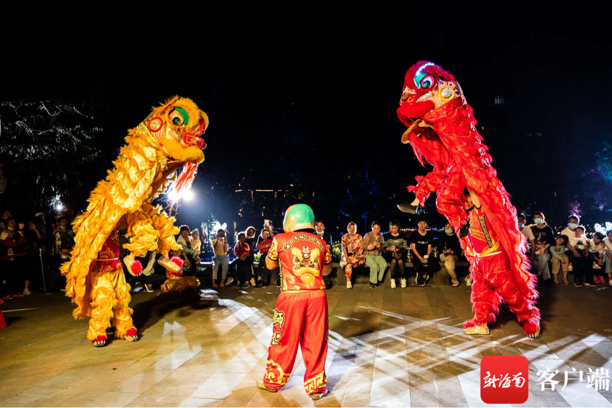 3月14日晚,海口市五公祠舞獅隊(duì)伍表演雄獅飛騰跳躍,在陣陣強(qiáng)勁有力的鼓樂配合下舞動歡騰。記者 李昊 攝