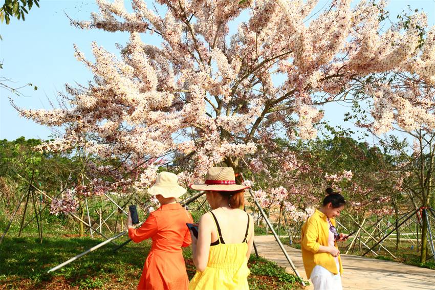 除了海口,海南其他市縣的櫻花也爭相盛開。儋州蘭洋鎮的藍洋櫻花莊園火了!3000多株櫻花競相盛放,粉白、粉紅的花海勾勒出一幅春的畫卷,大批游客來到這片世外桃源,一睹櫻花的美麗。據悉,藍洋櫻花莊園是海南農墾旅游集團有限公司建設共享農莊的配套項目,2017年,該公司從廣東引種1300余株櫻花樹。經過精心培育,2020年春天,1000多株櫻花首次全面綻放,讓這片莊園迅速火爆“出圈”。隨后,櫻花莊園補種、擴種櫻花樹1000多株,修建了3萬平方米的停車場、3000平方米的櫻花廣場、游客服務中心以及其他游樂設施。