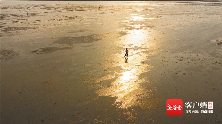 海口北港島,在金色夕陽里趕海的人。海南日報記者 李天平 攝