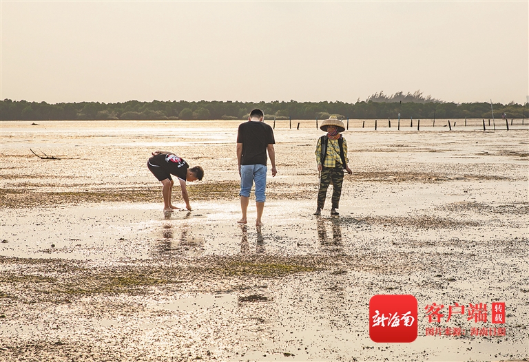 “每個月有兩次潮汐現象,有七八天的時間非常適合趕海,最低潮時海水能退去兩公里左右,這時的灘涂就成為游客們的樂園。適合趕海的時間,民宿的入住率就會提高,可以說,趕海已經成為民宿的固定體驗項目。”臨高觀海民宿老板陳曉杰告訴記者,為此,民宿特別配備了鏟子、小桶、手套、鞋子等工具,為前來趕海的游客提供服務。