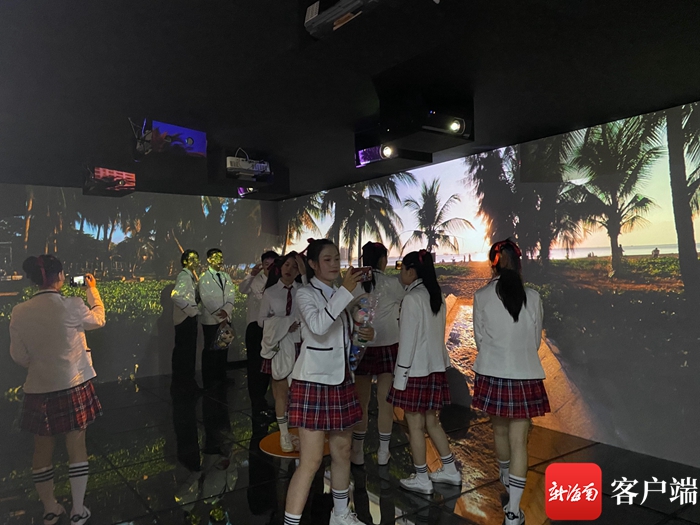 在沉浸式體驗區內,四周搭建起的幕布讓整個房間“化身”為360°全景影院,置身其中,觀看四周播放的視頻,身臨其境。開館當天上午,三亞市第四中學的一些學生們便涌入其中,體驗光電帶來的特殊感受。