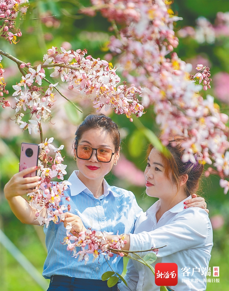 “快看,這里的櫻花開得多旺!快幫我在樹下拍張照。” 4月5日,在儋州市蘭洋鎮的藍洋櫻花樂園,熱帶櫻花競相綻放,粉色的花浪隨風而動,專程從海口前來的游客王蕾和朋友興奮地拍照“打卡”。
