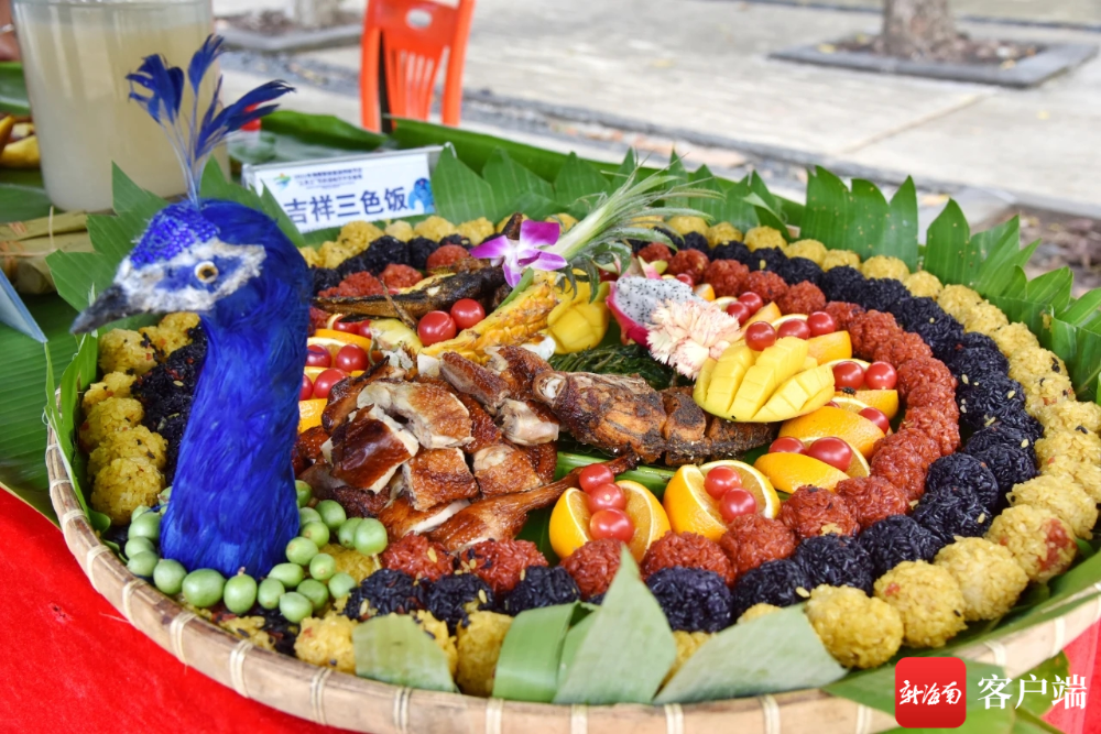 開幕式現(xiàn)場(chǎng)還設(shè)置了黎苗特色美食展示品嘗區(qū)。在黎族特色長(zhǎng)桌宴上,翠綠的芭蕉葉上盛著的三色飯、小魚干、竹筒飯、腌肉脯、山蘭酒等各色黎族特色美食令人食欲滿滿。市民游客們觀賞著婀娜多姿的黎苗歌舞,一口竹筒飯、一口山蘭酒,充分體驗(yàn)了解了黎族苗族豐富的傳統(tǒng)文化。