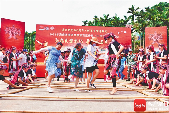 4月14日,澄邁縣仁興鎮新興苗村的苗族同胞和游客載歌載舞,慶?!叭氯?。通訊員 張仁圣 攝