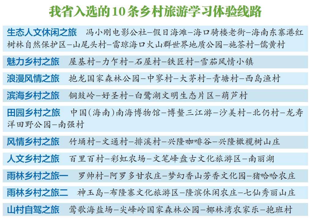 海南日?qǐng)?bào)海口5月12日訊 (記者趙優(yōu))為適應(yīng)人民群眾日益增長(zhǎng)的鄉(xiāng)村旅游需求,進(jìn)一步豐富鄉(xiāng)村旅游產(chǎn)品供給,結(jié)合慶祝中國(guó)共產(chǎn)黨成立100周年,深入開展“四史”宣傳教育活動(dòng),文化和旅游部近日聯(lián)合國(guó)家發(fā)展改革委推出“體驗(yàn)脫貧成就·助力鄉(xiāng)村振興”鄉(xiāng)村旅游學(xué)習(xí)體驗(yàn)線路300條,海南10條線路入選。