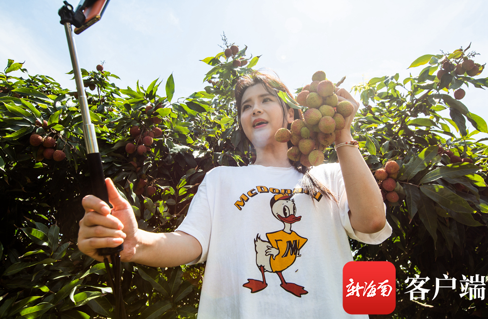 海南網紅在海墾紅明農場公司的荔枝園里,向網友推介成熟的荔枝。記者 李昊 攝
