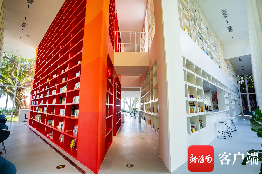 天涯書局為全玻璃幕墻結(jié)構(gòu),可360°透視觀景。從外向內(nèi)看,紅色漸變書架如火焰,白色書架如冰山,充滿幾何美感的三角形立面透過玻璃幕墻和椰林樹影,隱隱地吸引著游客的目光。書局室內(nèi)分為兩層,面積近450平方米,目前收納有圖書1800種,近兩萬冊,被營造成極具生活美學的復合型文化空間,集結(jié)了主題書店、創(chuàng)客空間、藝術(shù)長廊、創(chuàng)意市集、咖啡輕食、手工藝坊、親子空間、場地服務等功能于一體,在這里可以舉辦面對面的讀書交流、分享、文學沙龍、現(xiàn)場脫口秀、電影放映等活動,也可以看書、喝咖啡、看景、發(fā)呆,從內(nèi)向外看,室外的浪漫海景觸手可及。