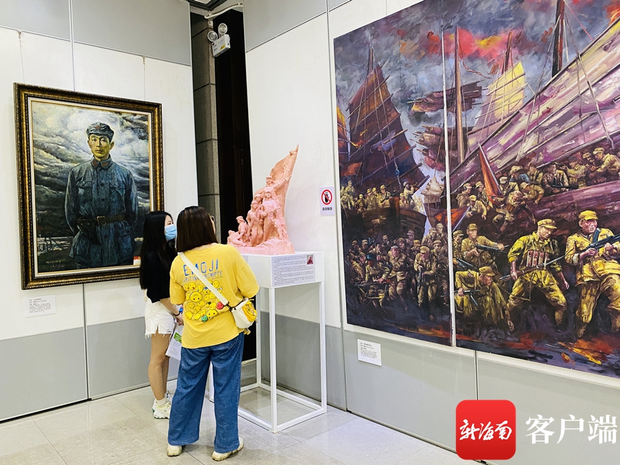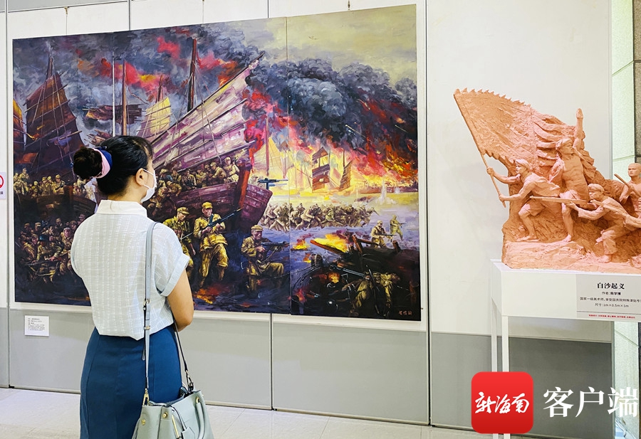 紅色經(jīng)典美術(shù)作品展共展出47名藝術(shù)家的近80件藝術(shù)精品,展品鱗次櫛比地從門前廣場(chǎng)擺入大廳,呈現(xiàn)了一幕幕史實(shí)與意境融合、思想與藝術(shù)合一的紅色文化故事。其中畫作40多件,有曾祥熙的《牛嶺朝陽》、潘正沂的《姐妹們》、丁孟芳的《古有花木蘭今有娘子軍》等。雕塑作品30多件,有陳學(xué)博的《解放海南》、黃黎祥的《永恒的敬禮》等。