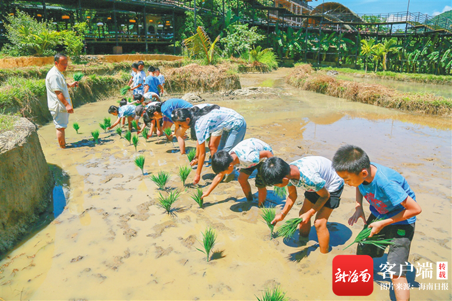 在檳榔谷的研學活動中,孩子們體驗插秧。(景區(qū)供圖)