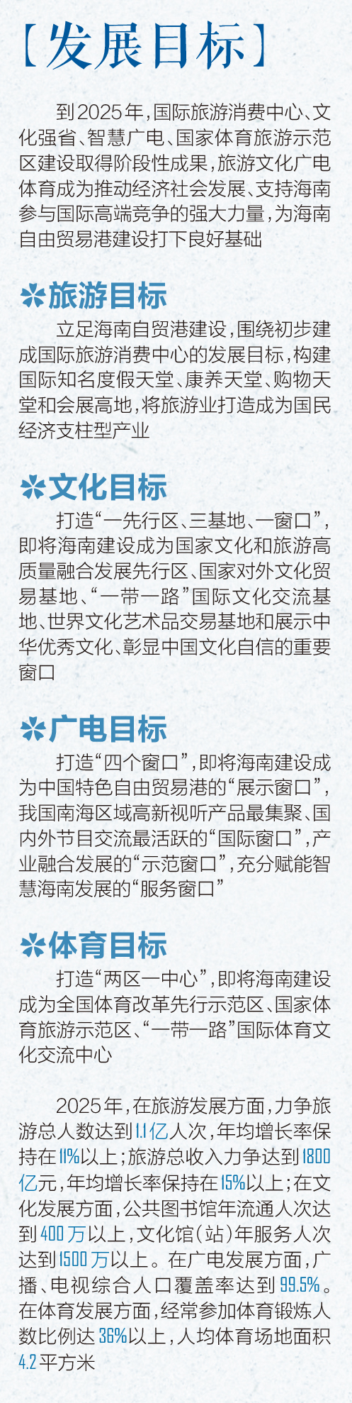 到2025年,國際旅游消費中心、文化強省、智慧廣電、國家體育旅游示范區(qū)建設(shè)取得階段性成果,旅游文化廣電體育成為推動經(jīng)濟社會發(fā)展、支持海南參與國際高端競爭的強大力量,為海南自由貿(mào)易港建設(shè)打下良好基礎(chǔ)