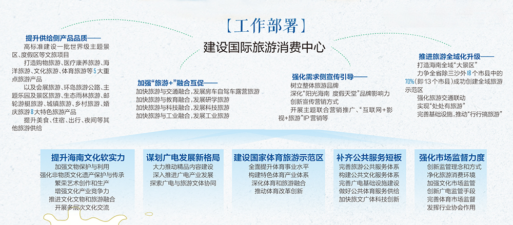 立足海南自貿(mào)港建設(shè),圍繞初步建成國際旅游消費中心的發(fā)展目標(biāo),構(gòu)建國際知名度假天堂、康養(yǎng)天堂、購物天堂和會展高地,將旅游業(yè)打造成為國民經(jīng)濟支柱型產(chǎn)業(yè)