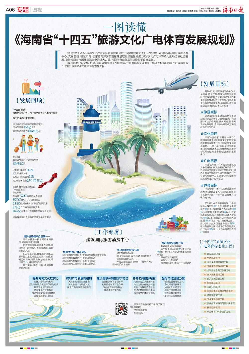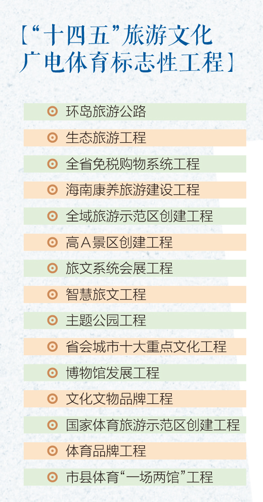 《規(guī)劃》對旅游、文化、廣電、體育分別提出了發(fā)展目標(biāo),并明確部署多項重點工作。《規(guī)劃》還明確了15項海南省“十四五”旅游文化廣電體育標(biāo)志性工程。