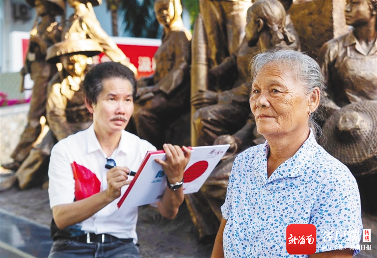 6月21日,在三亞市西島女子民兵連紀念館前,紅色的幕布緩緩落下,栩栩如生的雕塑出現在世人眼前。創作者許鴻飛用雕塑書寫了他與西島女民兵的故事。