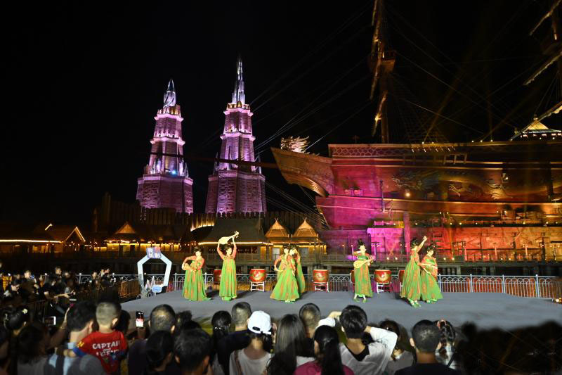 此次活動將奇幻樂園“絲路探險區域”進行全新包裝,通過聲、光、電等科技手段,打造光影幻境。以“唐宮宴舞”“敦煌飛天”等3小時不間斷的沉浸式表演重現大唐盛世。此外,還有“非遺火花秀”表演和水幕投影秀、特效電影娛樂項目、美食文創商品等助陣,打造多元素、全業態海口夜游新地標。 海口日報記者 石中華 攝