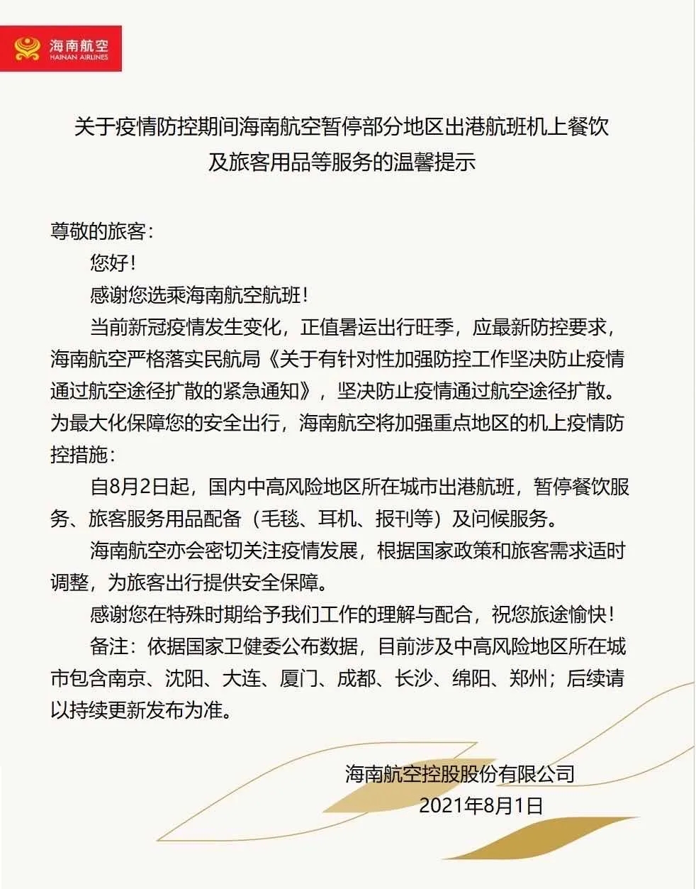新海南客戶(hù)端、南海網(wǎng)、南國(guó)都市報(bào)8月2日消息(記者 劉洋)8月2日上午,海南航空發(fā)布公告,海航將加強(qiáng)重點(diǎn)地區(qū)機(jī)上疫情防控措施,自8月2日起,國(guó)內(nèi)中高風(fēng)險(xiǎn)地區(qū)所在城市出港航班,暫停餐飲服務(wù)、旅客服務(wù)用品配備(毛毯、耳機(jī)、報(bào)刊等)及問(wèn)候服務(wù)。具體公告如下: