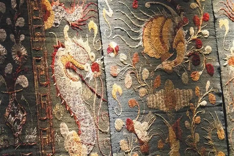 黎族龍被作為博物館中最具有代表性的文物,也被稱為“崖州被”,被長188厘米,寬124厘米,圖案為雙鳳朝陽麒麟,有著十分鮮明的藝術特征,這種藝術形式是黎錦所共有。龍被是黎族在紡、織、染、繡四大工藝過程中難度最大、文化品位最高、技術最高超的織錦工藝美術品,也是黎族進貢歷代封建王朝的珍品之一。