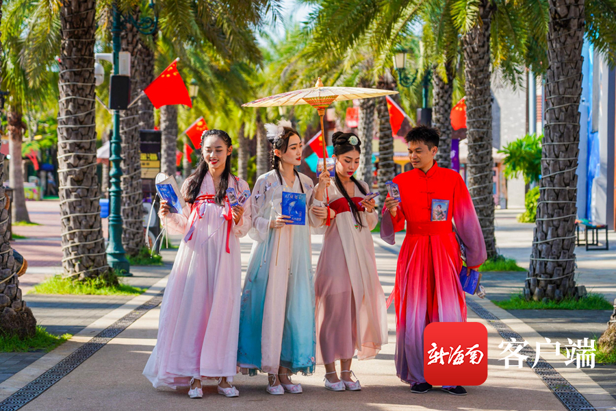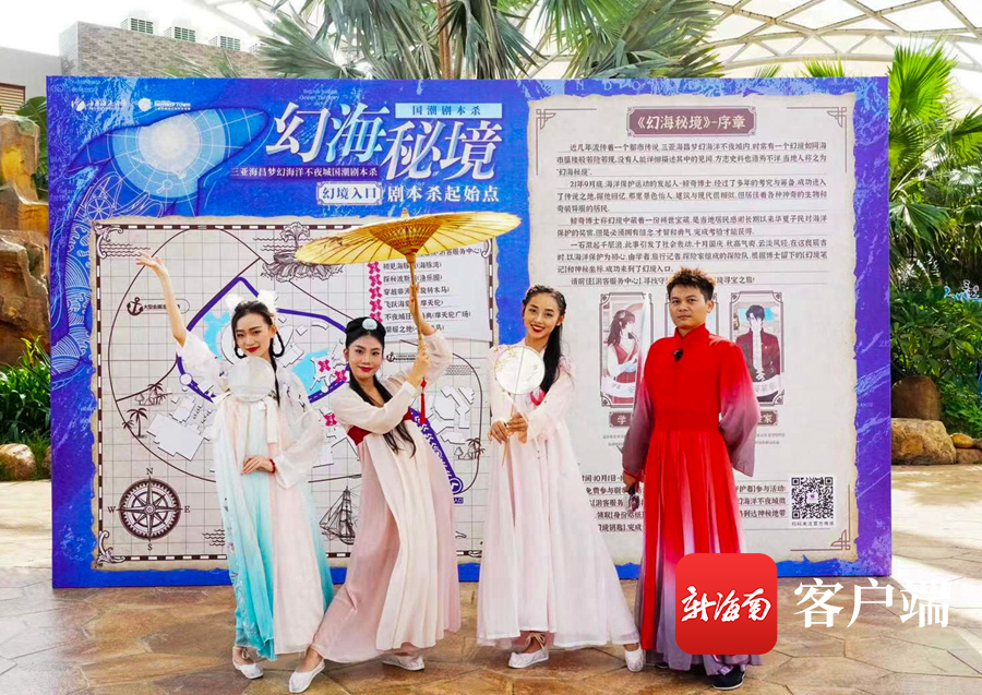 游客身著漢服打卡三亞海昌夢幻海洋不夜城。