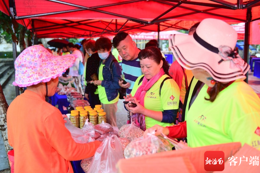活動當天,游客們滿懷熱情來到活動現(xiàn)場。在觀看優(yōu)美的舞蹈后,有的游客加入了竹竿舞的互動中,隨著歡快的節(jié)奏,體驗黎族這一傳統(tǒng)舞蹈;有的游客則是來到現(xiàn)場設(shè)置的農(nóng)產(chǎn)品市集,瀏覽著市集上展出的農(nóng)產(chǎn)品。市集現(xiàn)場還有當?shù)鼐用駷橛慰蛡儽硌荽螋亵危蚝玫聂亵瘟ⅠR售罄。