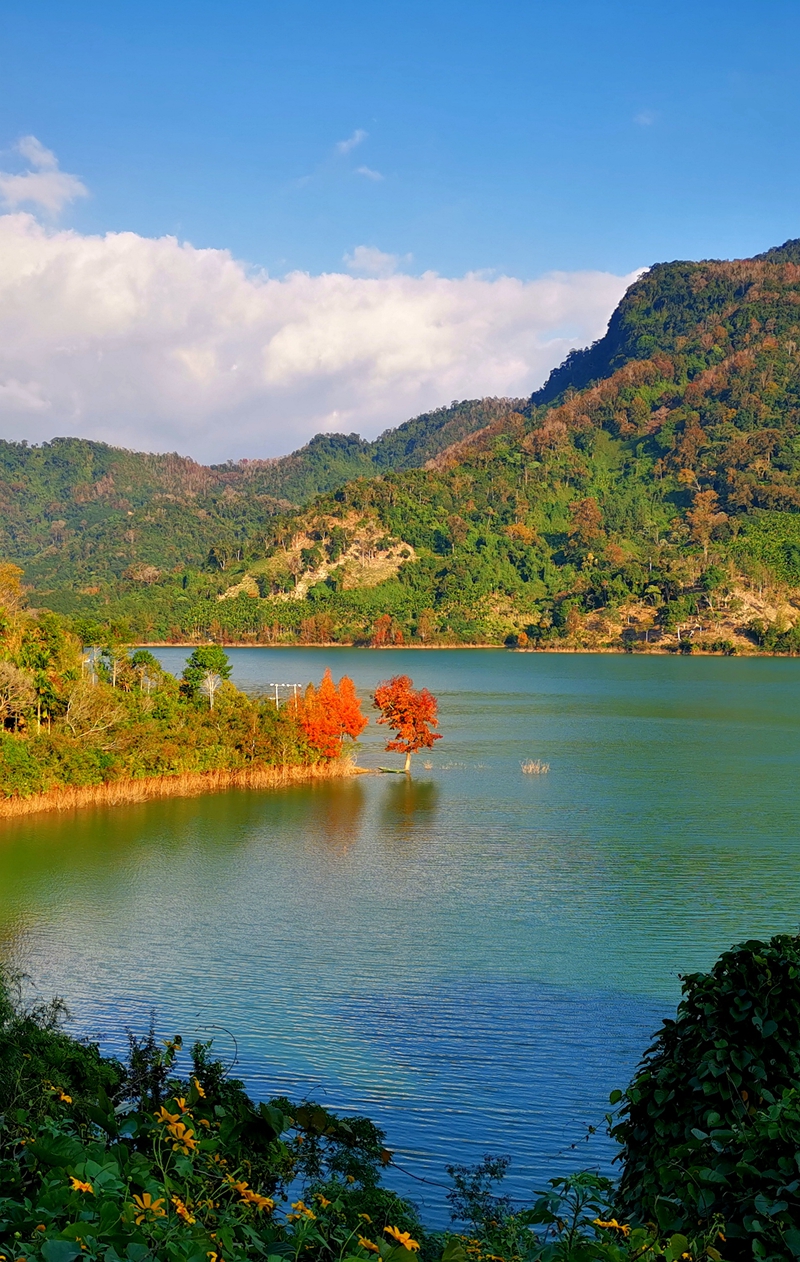 五彩的山林、清澈的湖面和潺潺的山泉,特別是新平村的一片紅葉林,游客可360度觀賞絕美秋景。