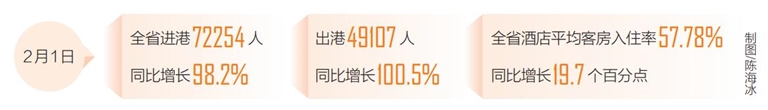 海南日?qǐng)?bào)記者從省旅文廳獲悉,2月1日,全省進(jìn)港72254人,同比增長(zhǎng)98.2%;出港49107人,同比增長(zhǎng)100.5%。全省酒店平均客房入住率57.78%,同比增長(zhǎng)19.7個(gè)百分點(diǎn)。全省經(jīng)營(yíng)性住宿單位接待過夜游客34.11萬(wàn)人次,同比增長(zhǎng)51.7%;A級(jí)旅游景區(qū)接待游客7.13萬(wàn)人次,同比下降16.6%;椰級(jí)鄉(xiāng)村旅游點(diǎn)接待游客4.61萬(wàn)人次,同比下降4.3%。