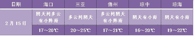 陸地天氣預報:預計2月15日,受偏東氣流影響,海南島北部、東部和中部地區多云間陰天有小陣雨,西部和南部地區以多云天氣為主。最高氣溫北部、東部和中部地區18~22℃,西部和南部地區23~26℃;最低氣溫全島15~20℃。