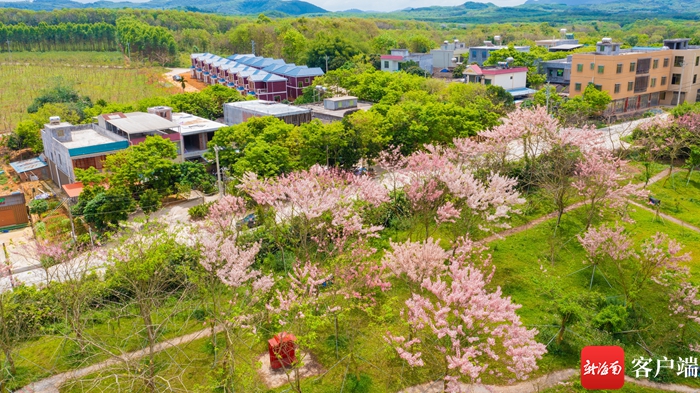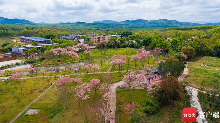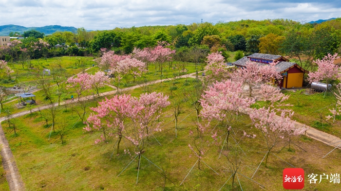 俯瞰位于儋州市蘭洋鎮(zhèn)藍(lán)洋居的藍(lán)洋櫻花樂園,櫻花樹盡數(shù)開花綻放。記者 李昊 攝