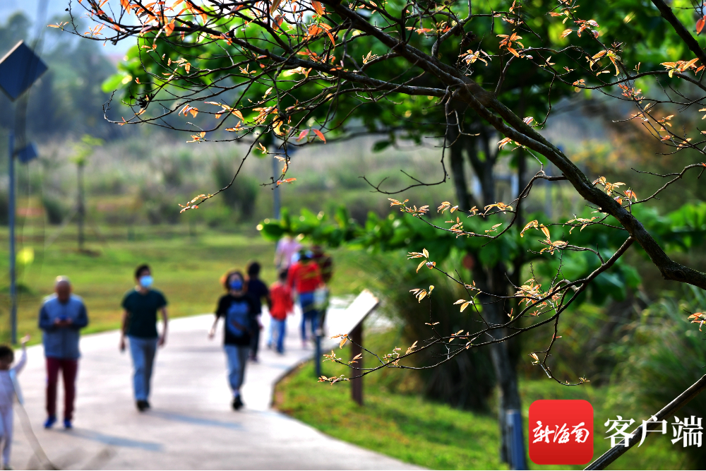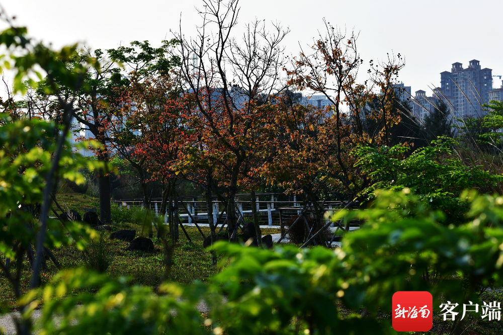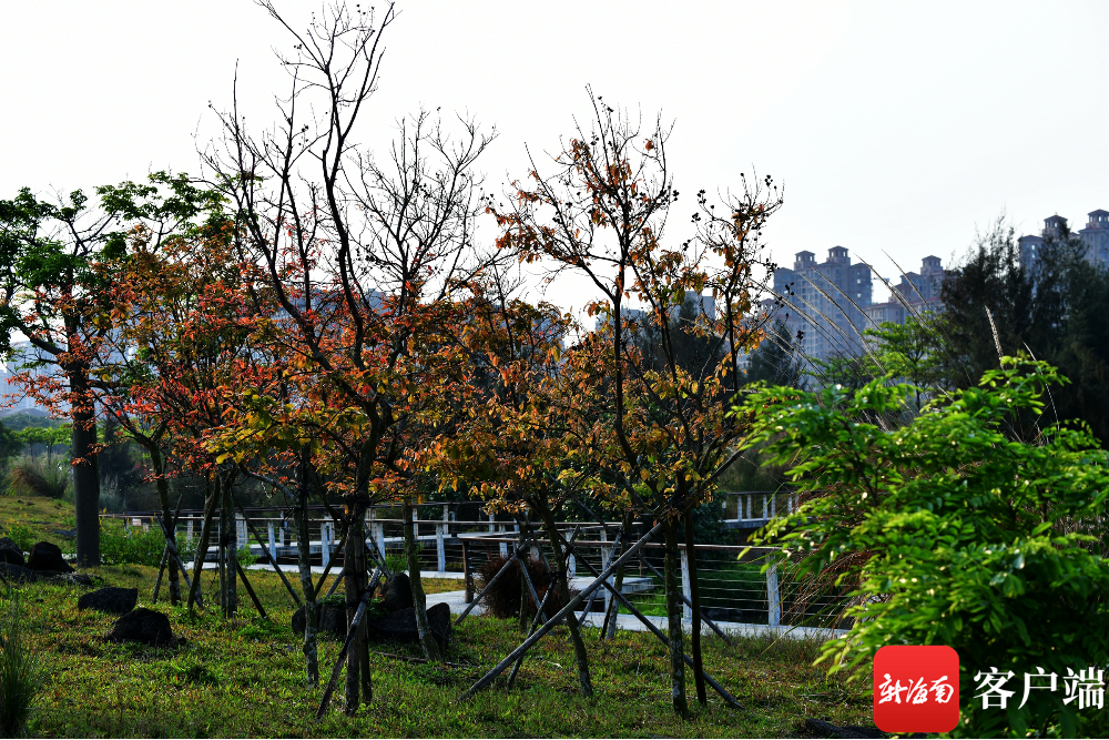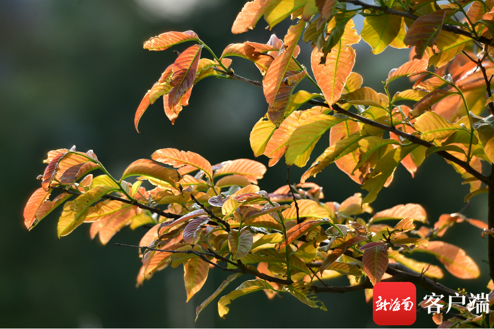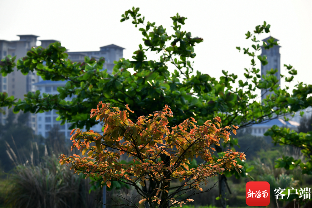 新海南客戶端、南海網(wǎng)、南國都市報(bào)4月8日消息(記者 陳衛(wèi)東)春天,春暖花開,滿眼綠色??墒窃诤?谖逶春訃覞竦毓珗@,有一部分樹木的葉子是黃色和紅色的,非常漂亮。這種同日不同景的現(xiàn)象,讓人產(chǎn)生了“穿越”進(jìn)秋天的感覺。
