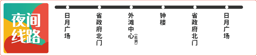 經停站點:日月廣場、省政府北門、外灘中心(云洞)、鐘樓、省政府北門、日月廣場