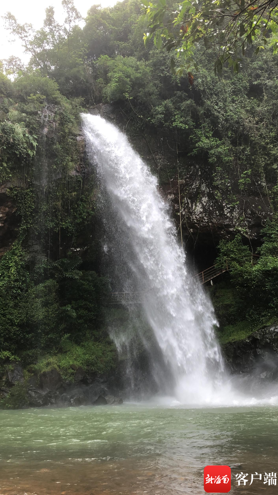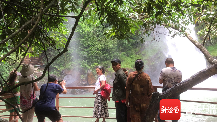 瓊海南牛瀑布引客來 提醒:汛期棧道易滑注意行走安全
