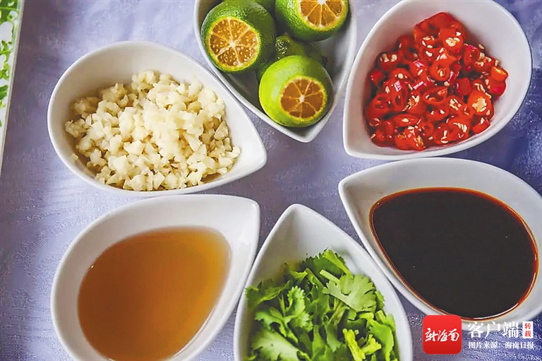 在海南人的餐桌上,蘸料從來都不只限于火鍋,即便是講究清淡、偏好鮮甜的瓊菜,在一碗又一碗的“揾碟”中,也暗藏著“野味”,人們可以視食材而做出味道不同的蘸料。飯菜備齊,碗筷擺好,最后調一碗蘸料,一頓飯才算是完整。有了蘸料,哪怕是同一盤菜,吃到嘴里卻是各自精彩。