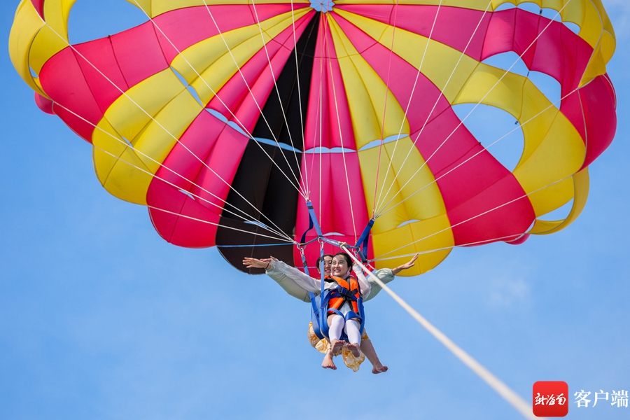 游客在三亞蜈支洲島旅游區(qū)體驗(yàn)彩虹拖傘。武昊 攝