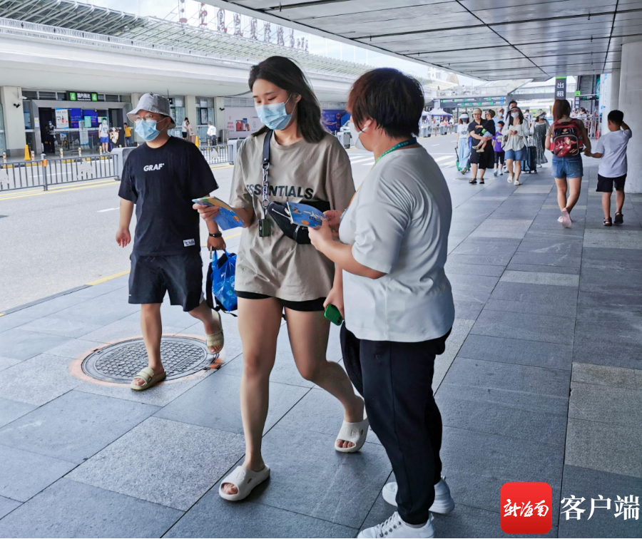工作人員在三亞鳳凰國際機場發放《一人一本惠惠游》宣傳冊。記者 沙曉峰 攝