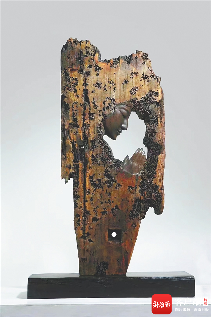 為了讓人物卷曲的絡腮胡更加栩栩如生,吳孔德還專門設計了一款鉆頭,就為做出更精細的絡腮胡和頭發。除了在技法、工具上創新,吳孔德還在原料上加以創新。木雕師主要選用陰沉木即烏木來雕刻,此類木是千萬年前深埋在江河湖泊底層的枯木殘根。身處海南,除了陰沉木,吳孔德還將目光放在了船木上。