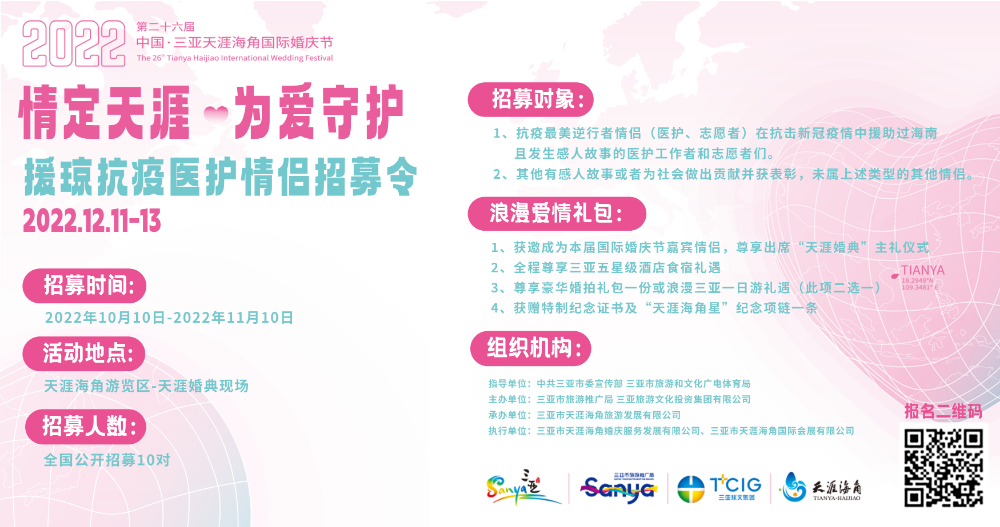 新海南客戶端、南海網(wǎng)、南國都市報(bào)10月10日消息(記者 沙曉峰)“情”到天涯海角來,2022第26屆中國·三亞天涯海角國際婚慶節(jié)如約而至。10月10日,“情定天涯,為愛守護(hù)”援瓊抗疫醫(yī)護(hù)情侶招募令線上發(fā)布,2022第26屆中國·三亞天涯海角國際婚慶節(jié)正式啟動(dòng),主體活動(dòng)將于12月11日至13日舉行。