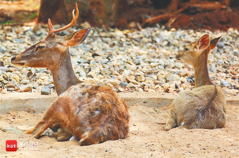 在海南熱帶野生動植物園內,大小坡鹿臥地休息。海南日報記者 李天平 攝