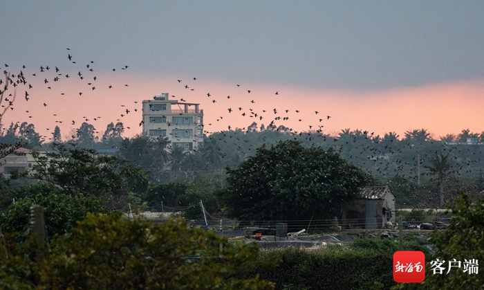 海南東寨港國家級自然保護區(qū)內(nèi),絲光椋鳥飛過夕陽。記者 李昊 攝