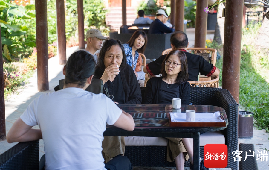 坐在長廊里的藤椅上,文化名家們品嘗著熱茶,眼前是伸手可及的連片稻田,遠處是滿眼青黛的群山,身后是錯落有致的船型茅草屋。山風吹來,涼爽無比,置身其間,猶如世外桃源。