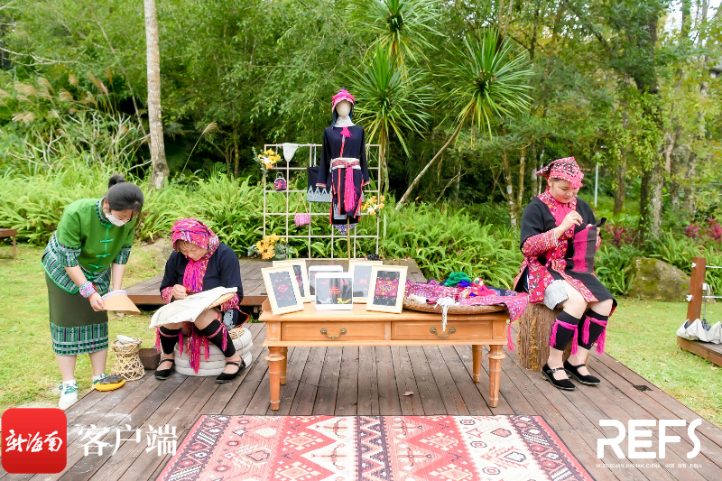 精美的黎族苗族刺繡服飾、手工編制的藤編、醇香的五指山大葉茶……五指山非遺對外交流座談會現場,五指山非遺文化受到資深時尚媒體人、服裝設計師等中國時尚圈文旅產業大咖的喜愛和關注。同時,座談會在戶外舉辦,參會嘉賓沉浸在五指山的雨林風光中,一邊享受雨林的秀麗風光,一邊共同探討黎錦、苗繡等非遺產品產業發展新路子。