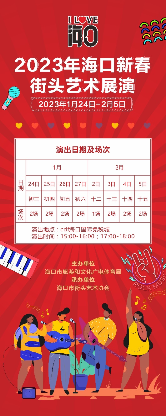 新海南客戶端、南海網(wǎng)、南國都市報1月23日消息(記者 丁文文)民族紅歌、流行搖滾、動感爵士、優(yōu)質(zhì)說唱……由海口市旅文局主辦,海口市街頭藝術(shù)協(xié)會承辦的2023年海口新春街頭藝術(shù)展演活動將于1月24日至2月5日(正月初三至正月十五)分別在海口國際免稅城與海口日月廣場舉辦。