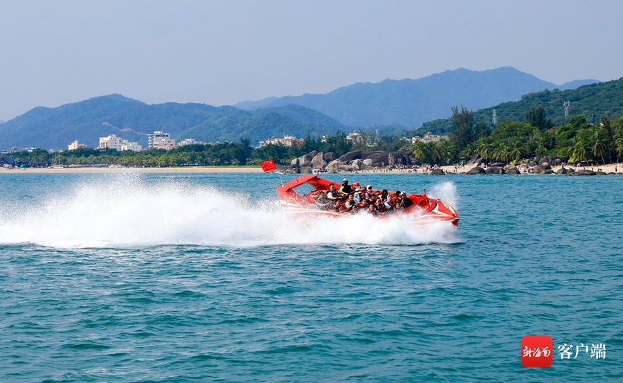 游客在天涯海角游覽區乘坐動感飛艇。三亞旅文集團供圖