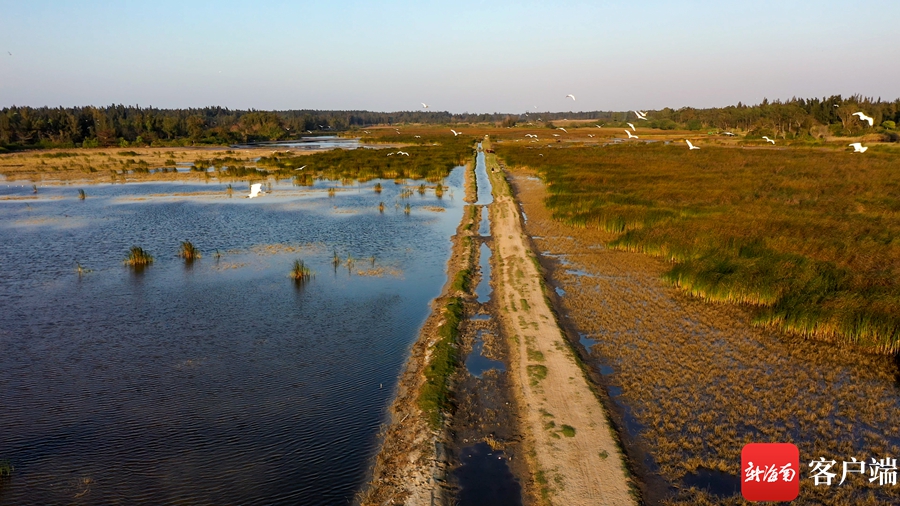 新海南客戶端、南海網(wǎng)、南國都市報2月13日消息(記者 劉孫謀)當(dāng)無人機(jī)穿越碧綠的海水,俯瞰在木麻黃林間的昌江旅游公路,在昌江海尾濕地公園路段,路面已經(jīng)鋪上瀝青。行走在該路段時,不僅可以享受徐徐海風(fēng)吹來,還能觀看越冬水鳥以及林鳥。夕陽下,濕地里成群結(jié)隊(duì)的白鷺在此覓食,白骨頂雞在濕地里覓食,人與動物近距離相處,守望著這優(yōu)美生態(tài),晚霞余暉海天一色。