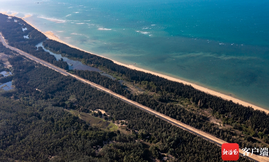 俯瞰海南旅游公路昌江海尾旅游公路路段,兩旁木麻黃,遠(yuǎn)處是大海跟濕地。劉孫謀 攝