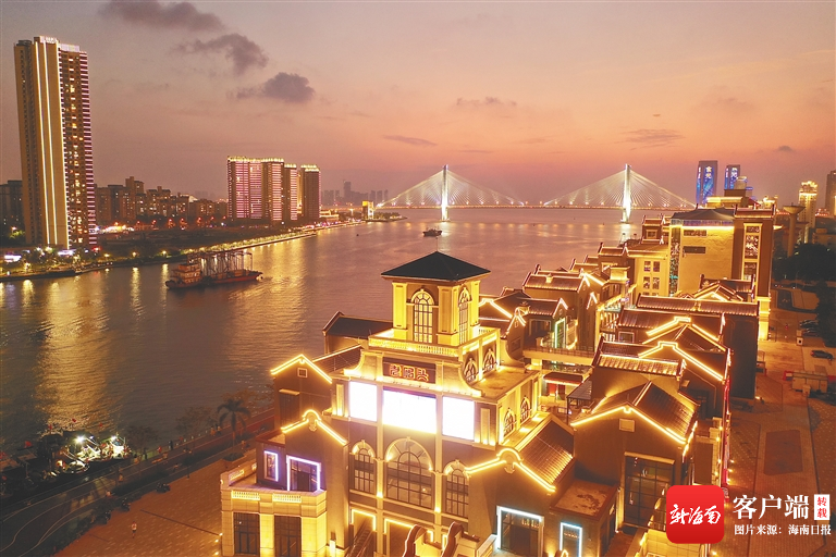 隔著海甸溪遙望對面的??跂|坡老碼頭風(fēng)情商業(yè)街,古典雅致的建筑錯(cuò)落有致,深灰色的墻衣搭配富有年代感的瓦片,在璀璨的霓虹映照下,仿佛穿越回曾經(jīng)繁榮的老碼頭。