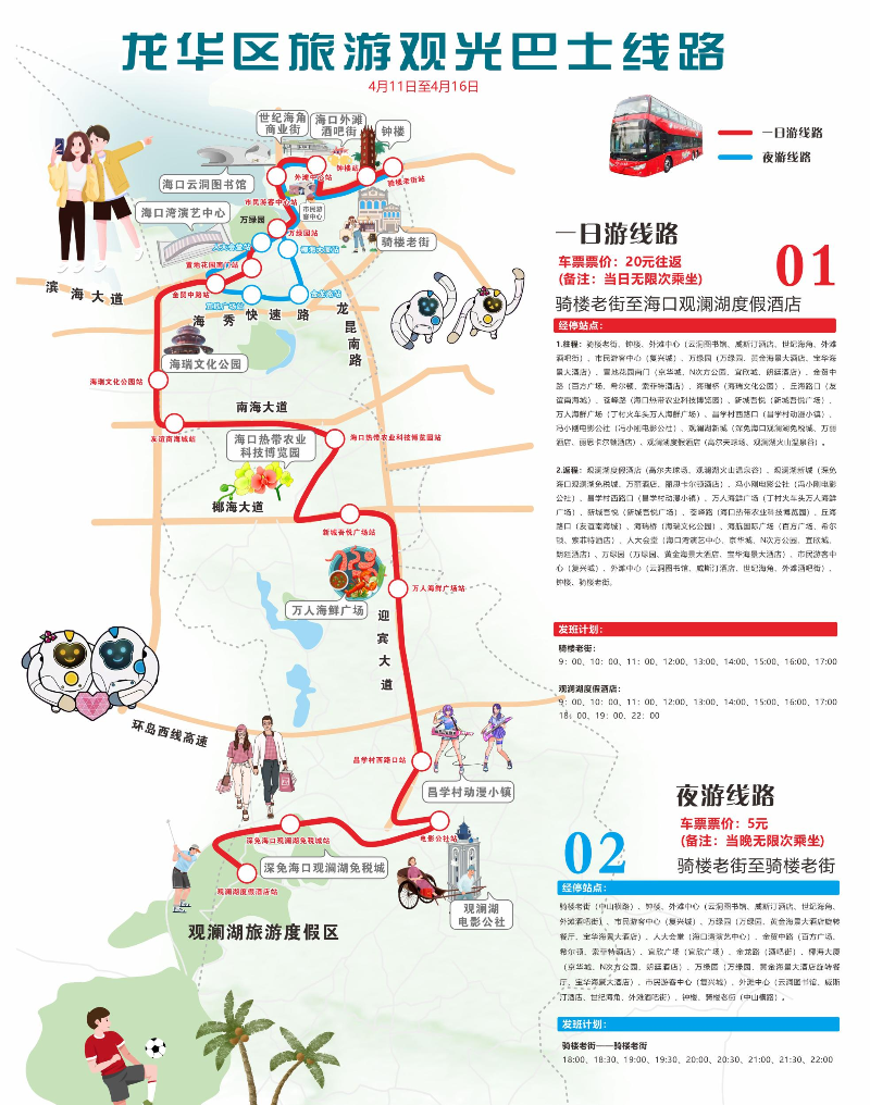 行駛于繁華街頭,穿行于地標之間,城市萬千風情盡收眼底,龍華區旅游觀光巴士線路分為日線和夜線兩條線路,覆蓋騎樓老街、外灘酒吧街、國貿商圈、觀瀾湖旅游度假區等,串聯龍華多個熱門景點,所有站點自由上下,讓大家一票在手,玩轉龍華!